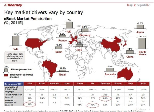 Une très intéressante étude de ATKearney nous montre entre autre la pénétration des ebooks par pays.