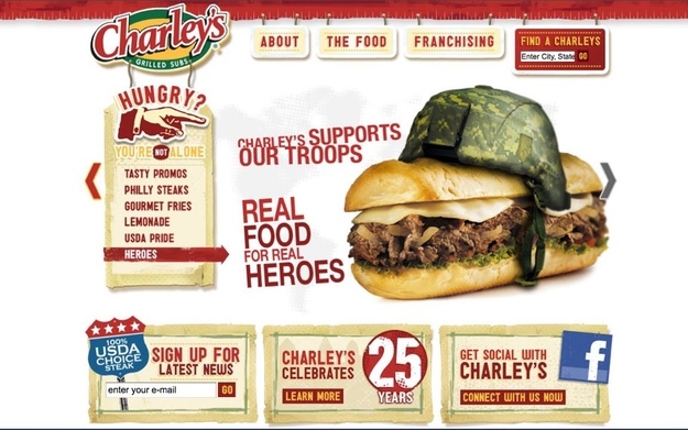 Allez, la pub du jour! Utiliser la guerre pour étayer sa communication je trouve ça déjà limite, mais aller coller un casque sur un sandwich avec de la viande froide… Du coup, je n’ai plus très faim là… Source : http://charleys.com/