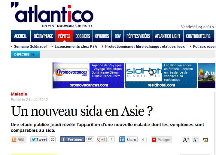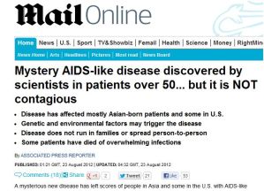 Certes quand on lit le corps de chacun des articles on apprend que cette maladie ne serait pas contagieuse et qu’elle n’est pas un nouveau Sida mais que les victimes présentent des symptômes similaires au Sida.